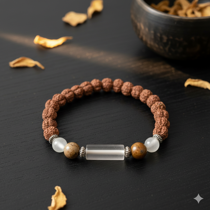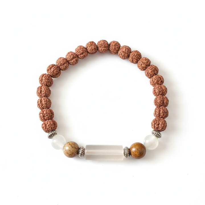 Ruled by Venus, this bracelet promotes emotional balance, beauty, and prosperity and 5 mukhi rudraksha provides peace of mind and spiritual growth