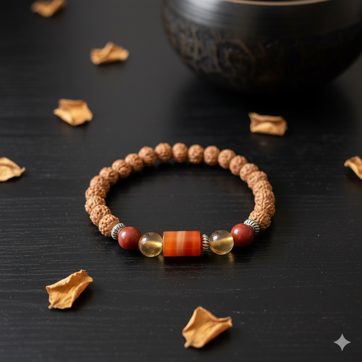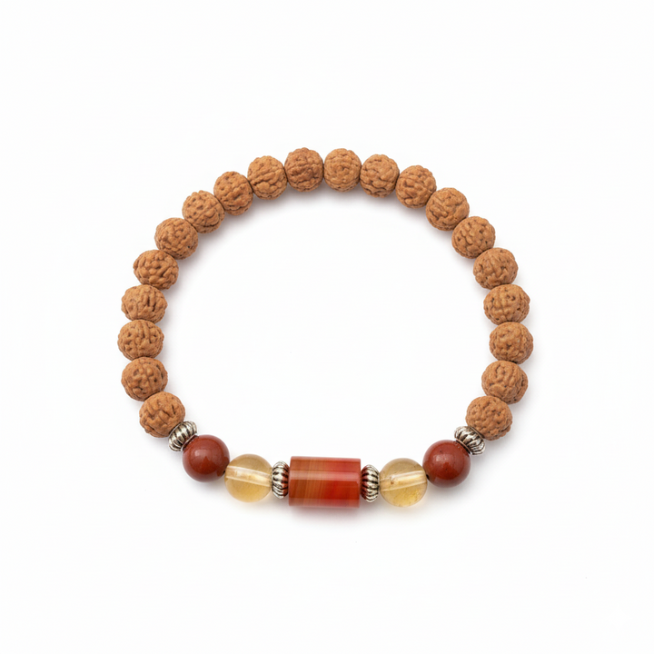 Powered by Mars, this bracelet boosts courage and confidence while calming aggression. Perfect for those who lead from the front and 5 mukhi rudraksha provides peace of mind and spiritual growth