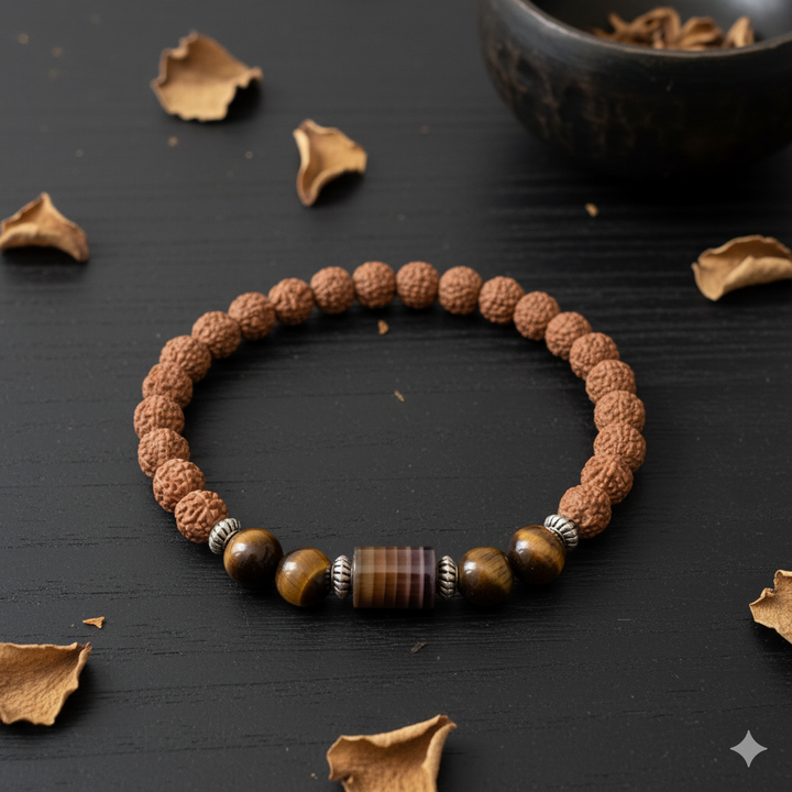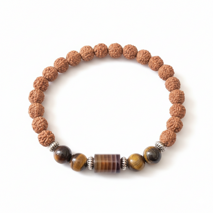 Powered by the Sun, this bracelet helps you lead boldly and shine naturally and 5 mukhi rudraksha helps in providing peace of mind and spiritual growth