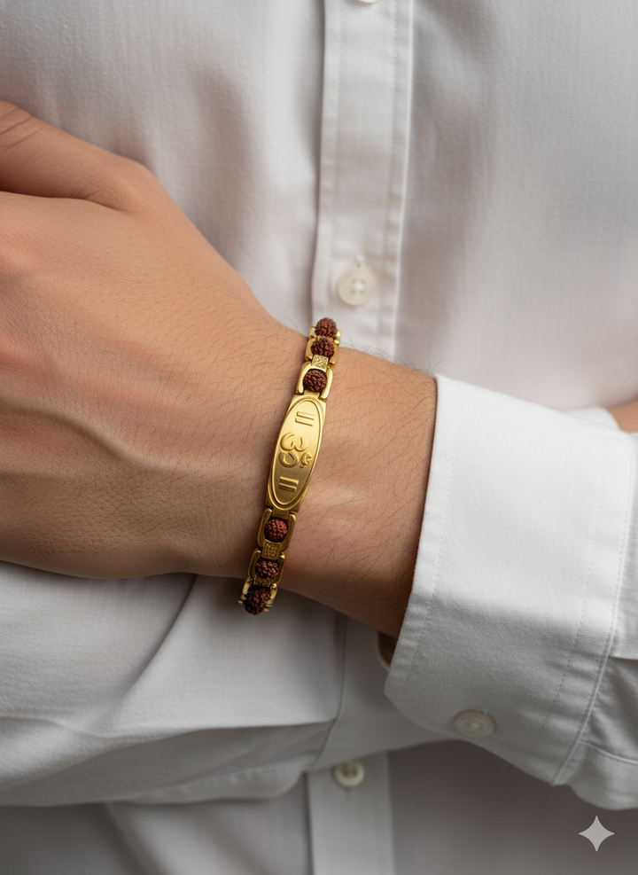 Radiate spiritual strength and timeless style with this exquisite Rudraksha Om bracelet, crafted in a refined gold and silver-tone finish. Featuring sacred Rudraksha beads known for their divine energy and an engraved Om (ॐ) symbol at the center, this bracelet harmonizes faith with fashion. Designed to channel peace, positivity, and protection, it’s the perfect adornment for men who walk the path of balance — between the spiritual and the modern.