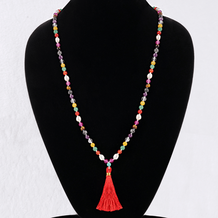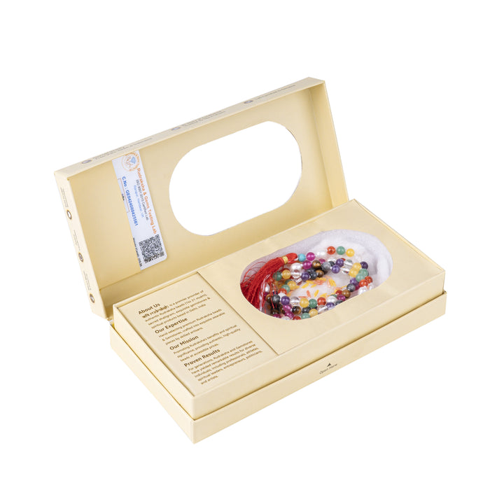 The Navratan Mala is a beautiful and powerful spiritual accessory made with high-quality nine gemstones, each representing one of the Navagrahas (Nine Planets). This sacred mala is designed to balance planetary influences and shield the wearer from negative energies and astrological disturbances.