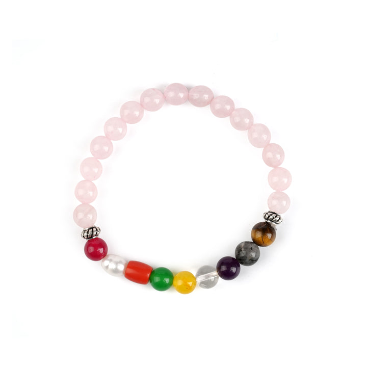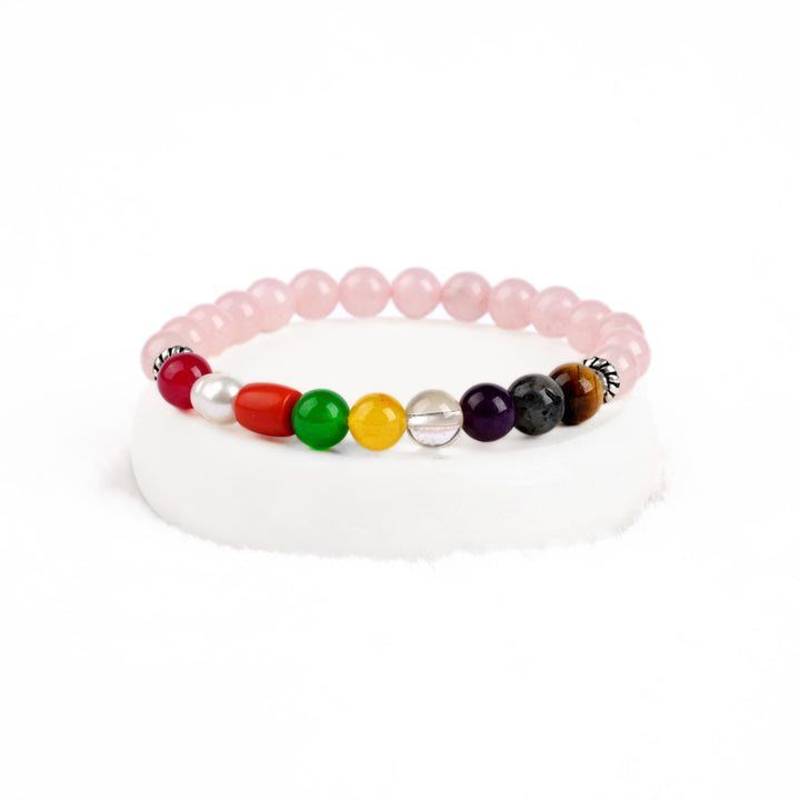 A graceful fusion of nine planetary gems (Navratan) and soothing Rose Quartz, this bracelet balances cosmic energies while nurturing the heart.