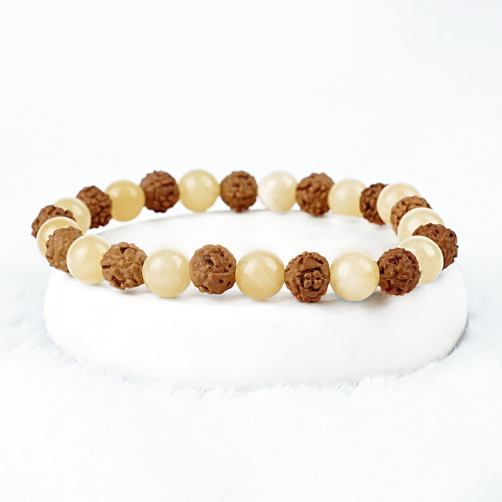 A radiant blend of sacred Rudraksha beads and Yellow Aventurine Quartz, this bracelet is designed to uplift your spirit, boost self-confidence, and bring clarity to your thoughts. Perfect for those seeking a balance of spiritual grounding and sunny energy.