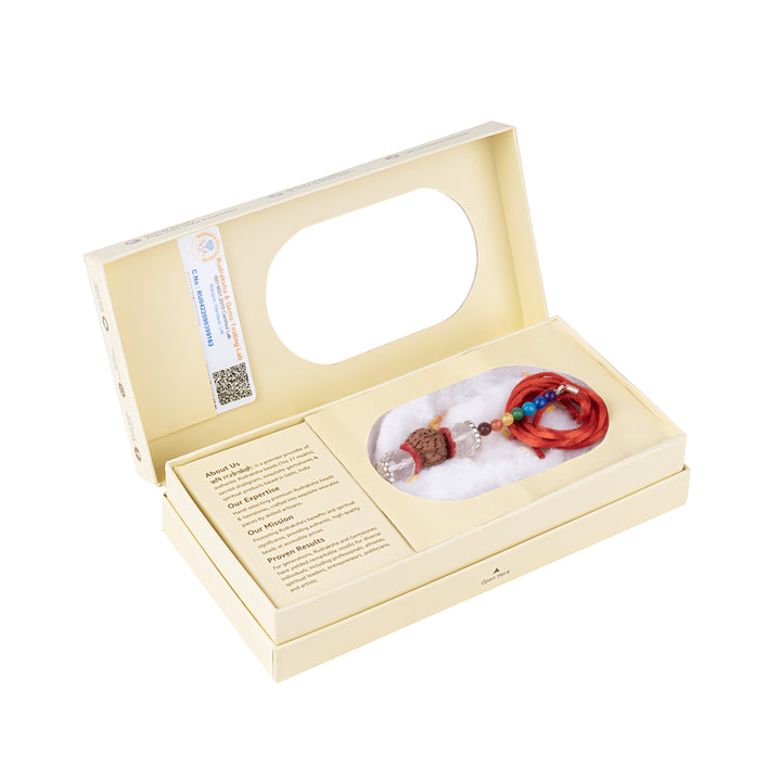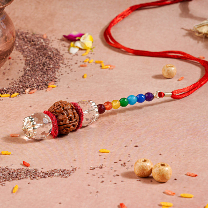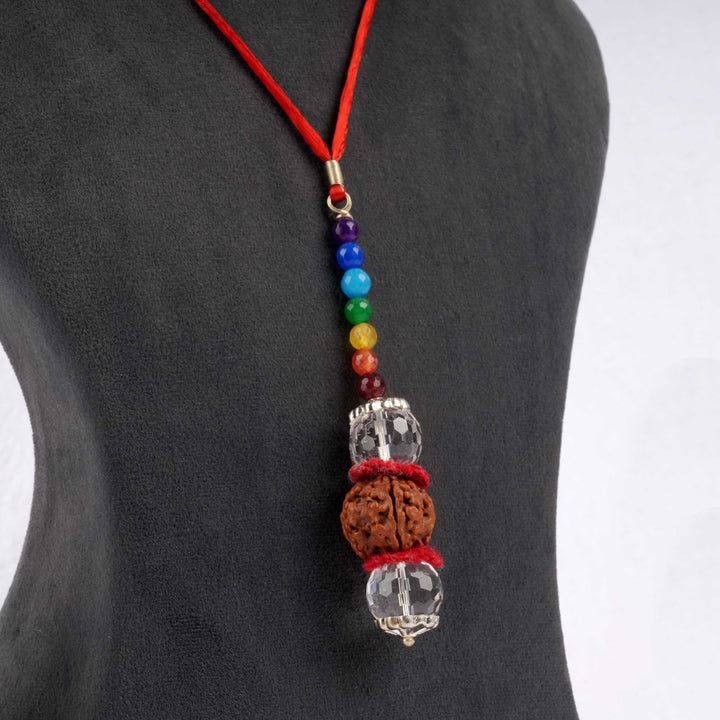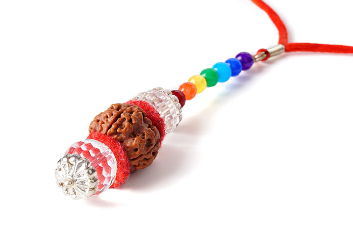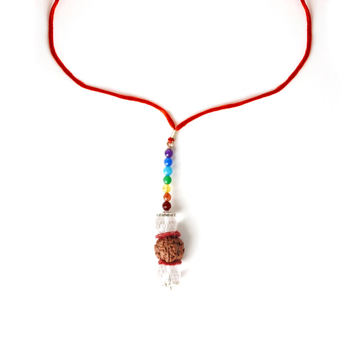 A unique and effective hanging made up of the combination of 1 bead of a 4 Mukhi Rudraksha with two large beads of Sphatik (crystal quartz) and seven stones for the seven chakras. It is designed to bring an increase in positive energy to any space and remove all kinds of Vaastu Dosh.
